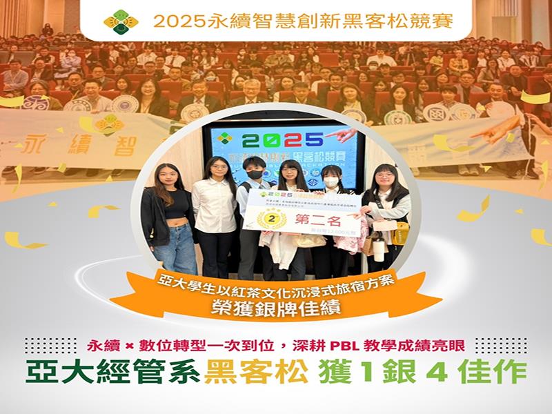 亞洲大學經營管理系在11校共同辦理的「永續智慧創新黑客松競賽」表現傑出,鄭家年老師、呂佳茹老師指導的參賽隊伍由全國417隊脫穎而出,共計奪得1面銀牌及4項佳作,「永續智慧創新黑客松競賽」為全台最具規模的「企業命題×學生解題」競賽,展現了亞大學子在數位轉型與永續創新領域的堅實實力。