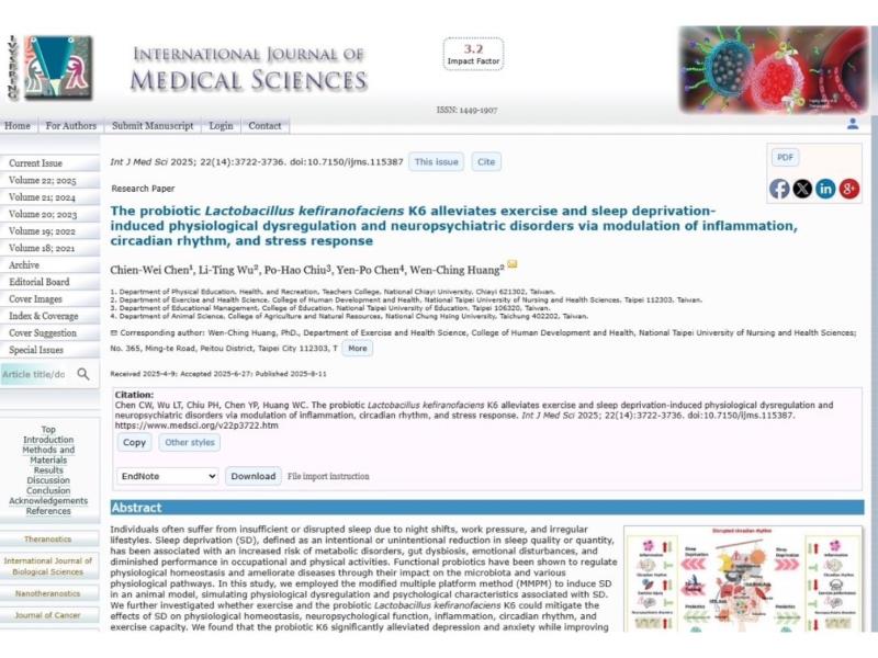嘉義大學體育與健康休閒學系陳建瑋助理教授攜手臺北護理健康大學、臺北教育大學及中興大學研究團隊,近期於國際知名醫學期刊《International Journal of Medical Sciences》發表最新研究成果。此項跨校、跨領域的合作,不僅彰顯嘉大在運動醫學、營養科學與跨領域健康促進研究上的深厚實力,更大幅提升嘉大在全球學術舞台的影響力與能見度。 這項研究的重要性在於針對現代人普遍面臨的睡眠不足挑戰,提出了一套確切可行的營養增補方案,特別適合那些需要保持高強度工作與運動表現的族群,幫助他們提升身心狀態。該研究透過動物模型,模擬睡眠不足與運動訓練負荷對生理造成的影響,並探討益生菌 Lactobacillus kefiranofaciens K6(克菲爾乳桿菌K6)補充,是否能有效緩解睡眠剝奪引發的生理失調、神經心理問題以及運動表現下降。研究團隊成功證實,補充益生菌K6能有效減輕憂鬱與焦慮症狀,改善葡萄糖耐受性及耐力運動表現;此外,更能透過降低發炎反應、調節晝夜節律基因及緩解壓力來全面提升整體健康,此研究為益生菌在健康促進與運動營養的應用上,提供了強而有力的新科學佐證。總結來說,益生菌K6有望成為一種有效的營養補充策略,不僅能減輕睡眠不足帶來的健康風險,還能提升身體面對睡眠剝奪與體能挑戰時的適應力與表現。 《International Journal of Medical Sciences》作為具有高度學術影響力與引用率的國際醫學期刊,刊登本次研究成果意義非凡。不僅彰顯嘉大「高等教育深耕計畫(C主軸)-多元健康促進」的卓越成效,也呼應聯合國永續發展目標(SDGs)中的「健康與福祉」及「優質教育」核心價值,突顯嘉大教師在跨校合作與國際學術交流上的重大突破。 嘉大表示,將持續支持教師推動跨領域研究與國際合作,致力將學術成果轉化為促進公共健康與社會福祉的強大動能,持續為全球健康議題注入創新力量。