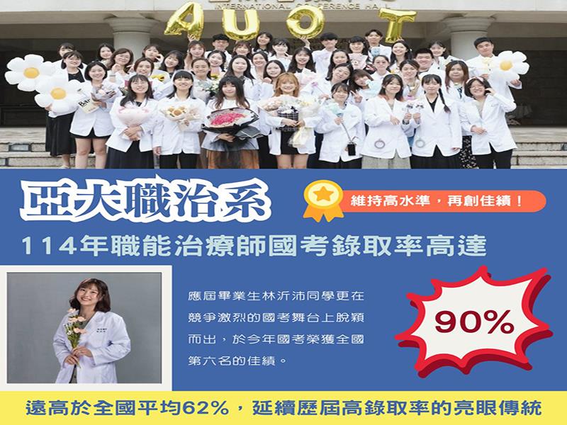 亞洲大學職能治療學系在114年職能治療師國考再創佳績!應屆畢業生通過率高達90%,遠超越全國平均62%,延續歷屆一貫的超強傳統!這份榮耀屬於每一位努力不懈的同學,也要感謝師長們一路的指導與陪伴。