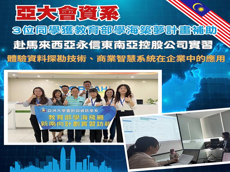 亞洲大學會計與資訊系李苡希、洪淑靖、王孟涵3位同學,獲教育部學海築夢計畫補助,赴馬來西亞永信東南亞控股公司實習1個月,強化實務操作能力,體驗資料探勘技術與商業智慧系統在企業中的實際應用,培育國際競爭力優勢。