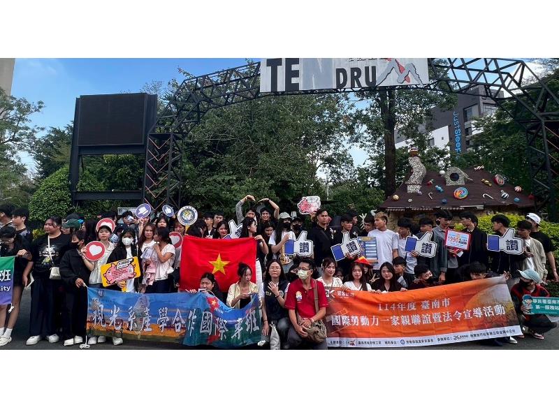 中華醫事科技大學【視光系】與【環境安全工程系】越南籍新生於10月31日參加由臺南市勞工局與學校共同舉辦的「勞動法令、居留法規及企業參訪體驗活動」。 活動結合多項實用主題,包括登革熱防疫、交通安全與電動機車騎乘規範等日常生活須知,並特別提醒外籍人士提高防詐意識與自我保護能力,協助同學們順利適應在台學習與生活。 內政部移民署也特別提醒:切勿攜帶或請親友寄送含肉類產品入境,以免違反防範非洲豬瘟規定。 此次行程安排參訪歸仁區「萬國通路創意觀光工廠」與「十鼓仁糖文創園區」,讓同學們親身體驗臺南在地產業創新與文創觀光魅力,收穫滿滿,留下難忘的留學初體驗。