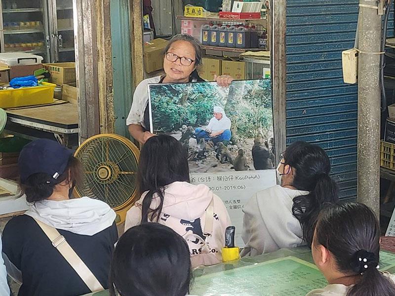 圖01.南華大學「永續環境與地方創生」跨領域學程師生至台南市南化區烏山獼猴區戶外教學,園區解說員介紹台灣獼猴生態、習性及家族結構。