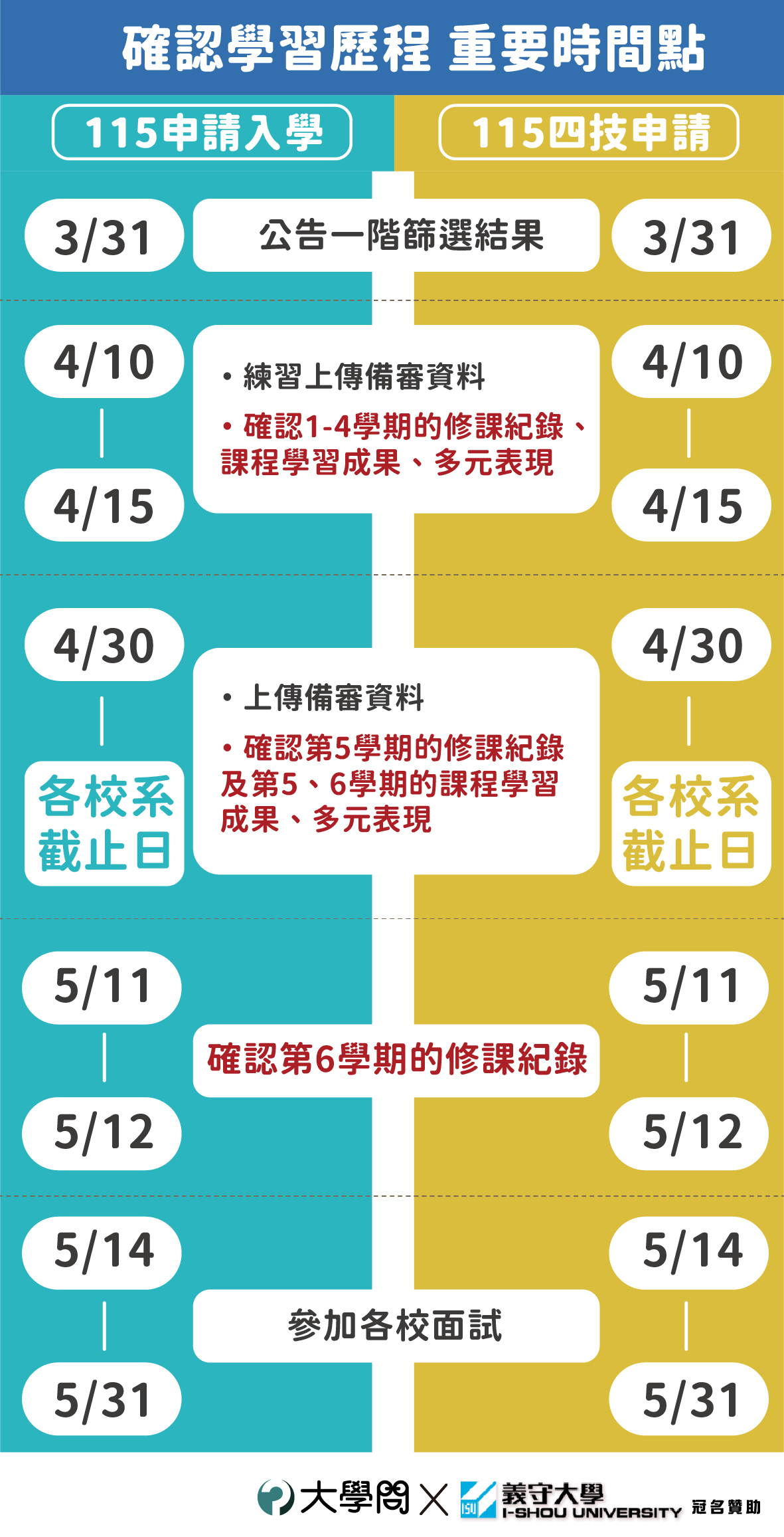 115年的「申請入學」將在3月31日公告一階篩選結果,考生們必須抓緊時間,開始準備學習歷程自述、多元表現綜整心得及面試筆試。但在參加面試前,有三個時間點務請考生一定要至甄選入學委員會「申請入學」的「審查資料上傳系統」,確認自己的學習歷程檔是否正確,包括:4月10日、4月30日、5月11日。