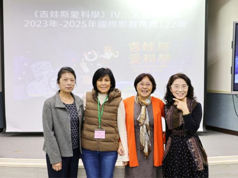 圖3:嘉大生化系楊奕玲教授(右2)策劃本次營隊,邀請長期致力於原民科學教育、2025年師鐸獎得主清大傅麗玉教授(右1)分享知名動畫《吉娃斯愛科學》。