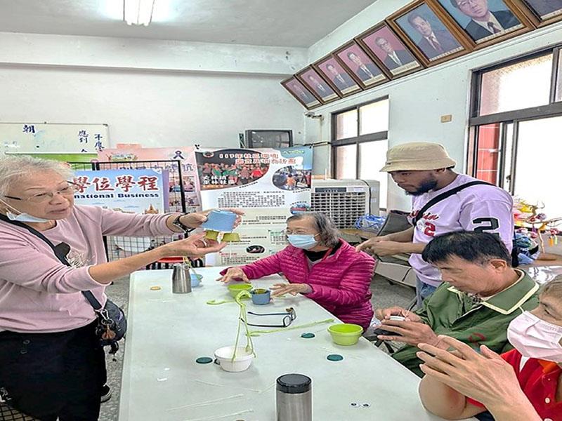 圖01.南華大學國企學程學生與社區長者青銀共學,一同製做「花盆人偶」,實踐USR與尤努斯三零願景。