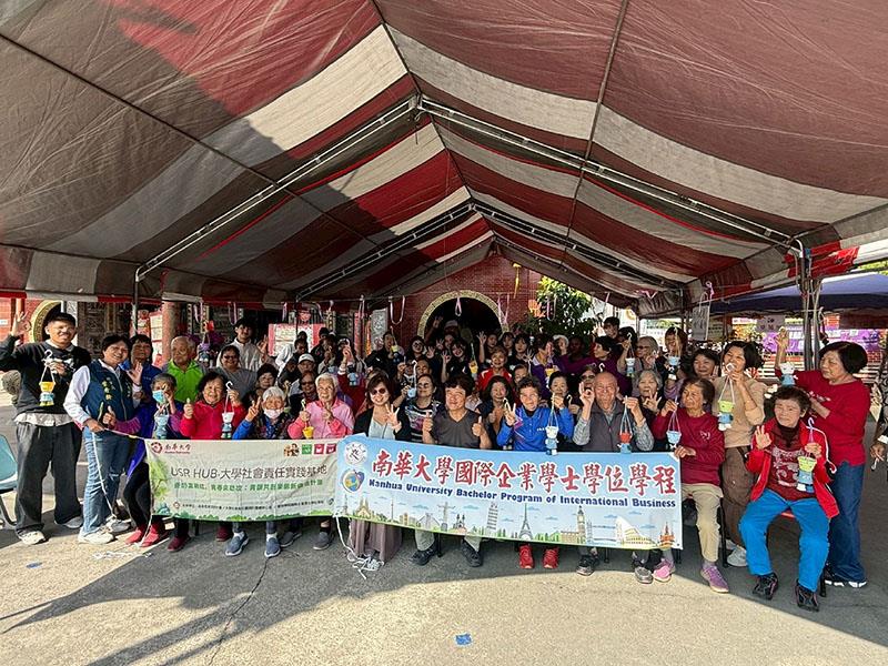 圖03.南華大學國企學程學生與平林社區長者青銀共學,並合影留念,實踐USR與尤努斯三零願景。
