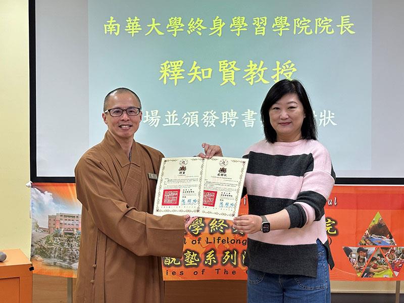 圖01.「教育版桌遊設計開發實戰班」第二期開班,南華大學終身學院院長釋知賢(左)頒發聘書及感謝狀予程云美老師(右)。