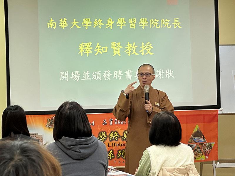 圖03.南華大學終身學院釋知賢院長於開場致詞勉勵學員透過教育桌遊,以寓教於樂的方式將善的種子播撒出去。