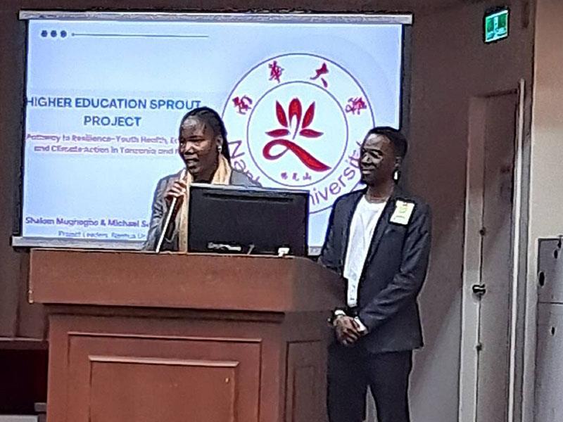 圖03.南華大學國際生受邀出席「全球國際交流合作・共榮共融」活動,分享返鄉實踐永續行動。馬拉威籍沐語彤(左)、坦尚尼亞籍麥可(右)。