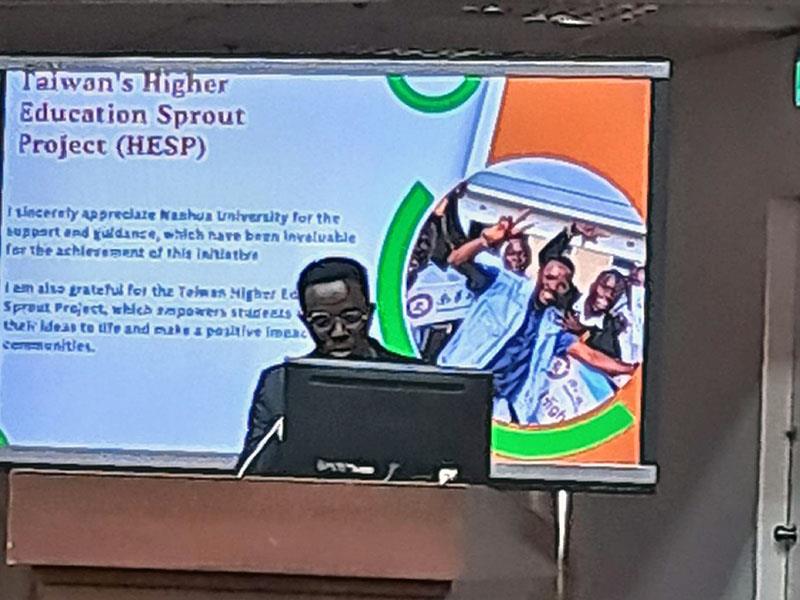 圖04.南華大學國際生坦尚尼亞籍麥可受邀出席「全球國際交流合作・共榮共融」活動,分享返鄉實踐永續行動。