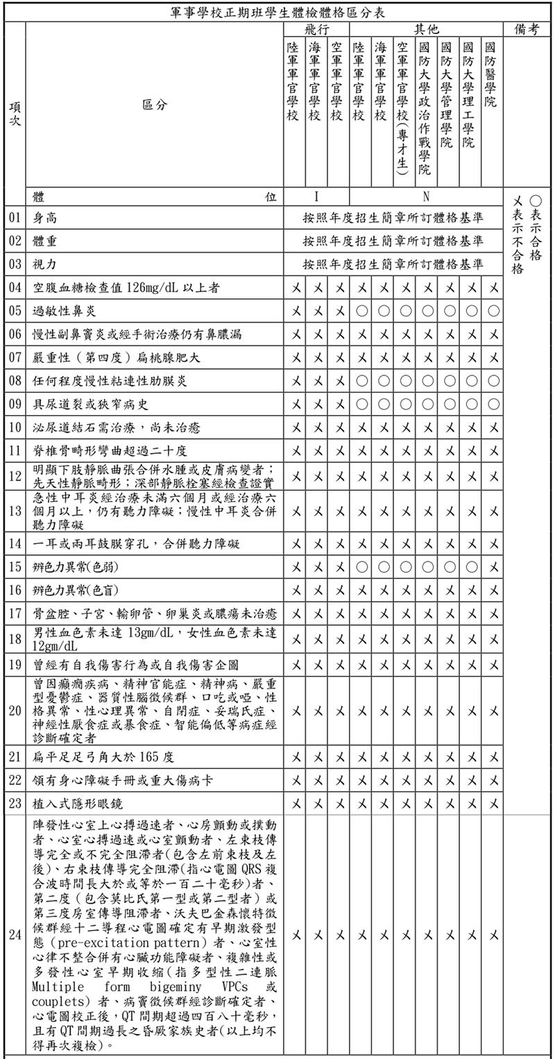 各校體檢體格區分表