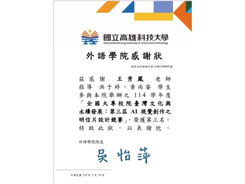 嘉義大學數位學習設計與管理學系大二洪于婷、黃尚睿同學,在該系王秀鳳教授指導下,參加由高雄科技大學外語學院執行、教育部指導之「數位人文跨域人才智慧領航計畫」所舉辦的「全國大專院校台灣文化與永續發展:第三屆AI視覺創作之明信片設計競賽」,表現亮眼,榮獲第三名佳績。