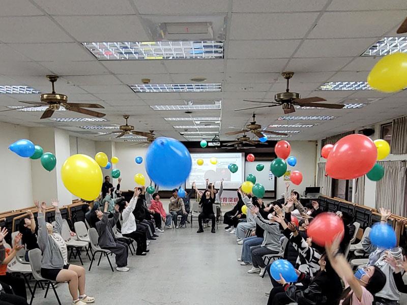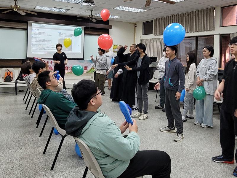 圖02. 南華大學生死系課程結合打擊樂實作,深化高齡生死教育。透過音樂節拍及氣球,讓學生觀察及學習與高齡者的互動節奏。