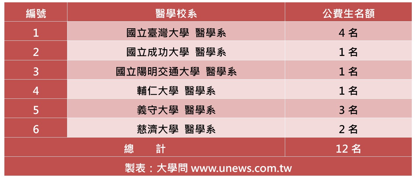 115學年度「考試分發」有6所大學的醫學系共提供12名公費生的招生名額,較去年減少18個。「大學問」(www.unews.com.tw)將此這些醫學系公費生的招生名額列表整理如下,供有志報考公費醫學系的高三生參考。