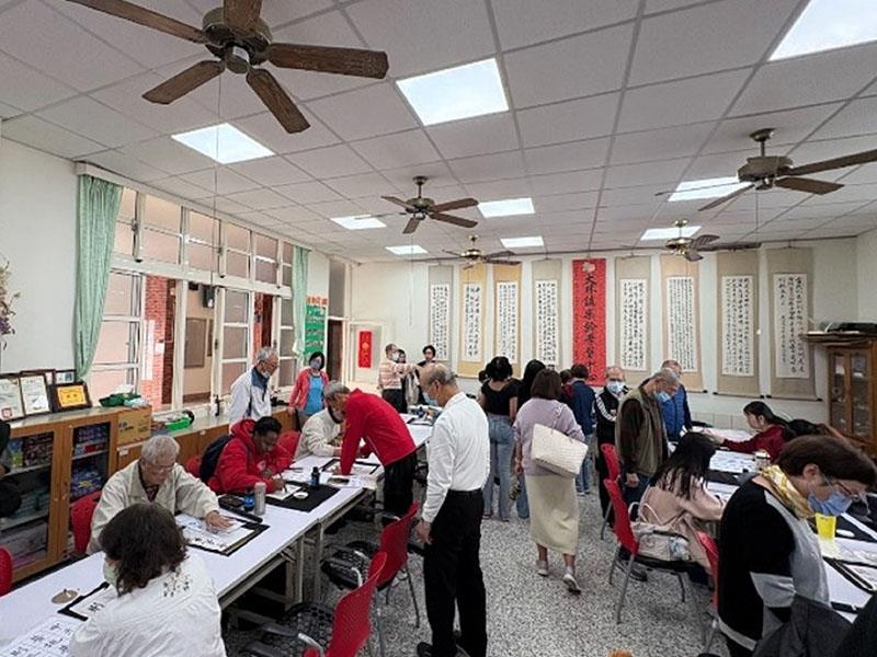 圖01.南華大學國企學程走入社區,國際生與大林長者青銀共學,學習書法。