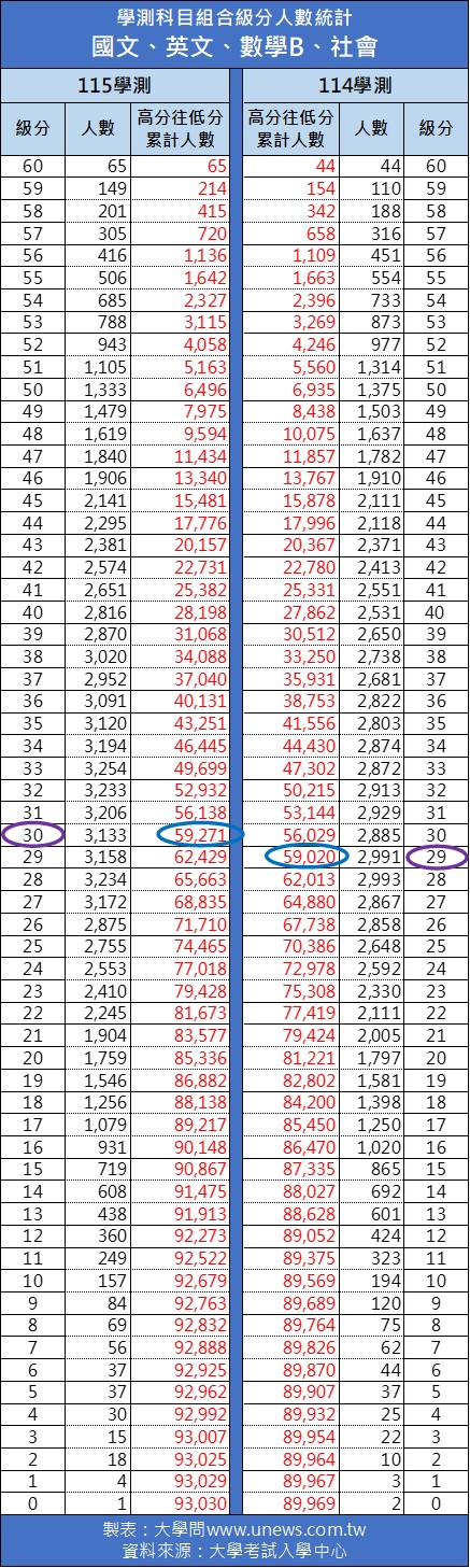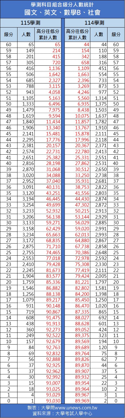 以「國英數B社」的科目組合為例,我們必須統計今年和去年這個組合從高分到低分的累計人數做個比較,因此在115和114年的級分人數百分比累計表中,取出該組合「自高分往低分 累計人數」那個欄位,再將兩年的資料併排檢視,可以如下圖般將「高分往低分 累計人數」欄集中調整在中間,這樣就可以清楚看到115和114年的60級分各有多少人,59級分以上累計各有多少人了(如下圖紅字所示)。