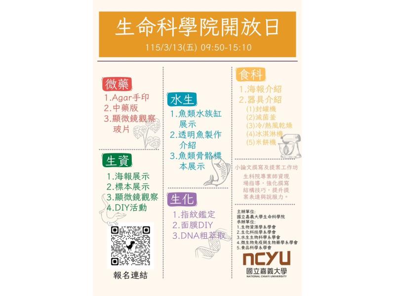 除強化線上即時互動外,嘉義大學亦同步推動校園深度體驗,3月13日在蘭潭校區舉辦「2026嘉大生命科學院開放日」(https://website.ncyu.edu.tw/cls/Subject/Detail/234850?nodeId=2706),由生化科技學系、水生生物科學系、生物資源學系、食品科學系及微生物免疫與生物藥學系共同規劃,進行系所介紹、資源展示並透過實作小課程與闖關遊戲,帶您瞭解各系特色及生命科學最新發展,進而確立生涯志向。