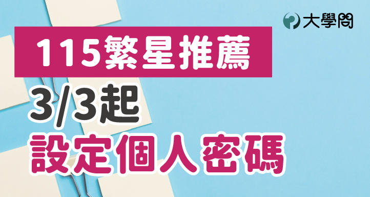 首次參加115繁星推薦的考生,需要事先上網設定「個人密碼」,作為之後報名狀態查詢、上傳審查資料、填志願使用。115年3月3日上午9點起,考生即可至「大學甄選入學委員會-繁星推薦」,進入「個人密碼設定」,設定個人專屬密碼。請考生及早完成設定,以免影響權益。