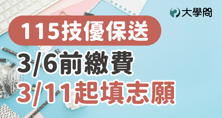通過115「技優保送」資格審查的同學請留意,請於115年3月4日上午10點至3月6日24點前完成報名費的繳交,而網路登記志願則是於115年3月9日上午10點開始,至3月11日下午5點截止。完成繳費的考生才可以上「技專校院聯合甄選委員會--技優保送」網站登記志願。