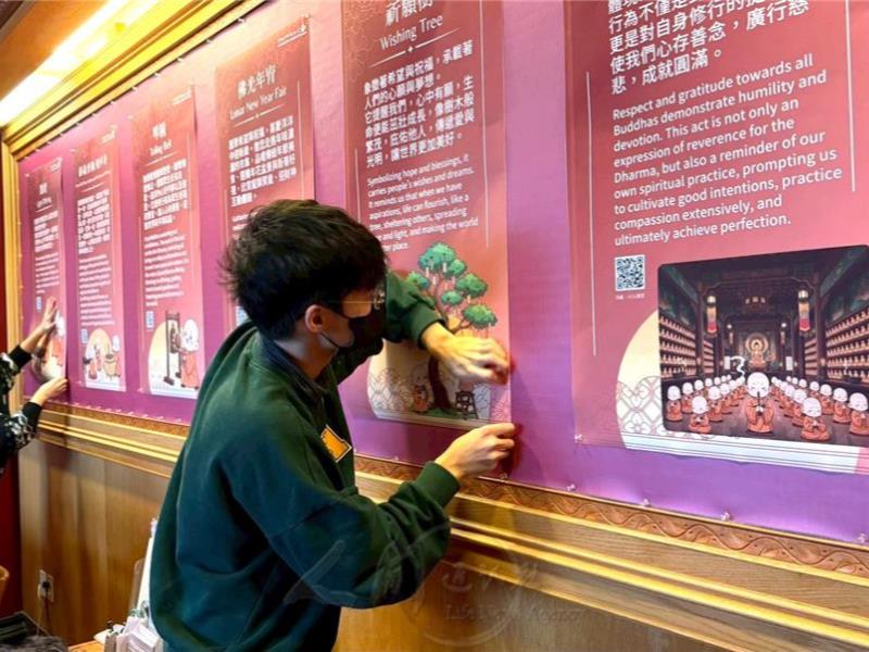佛光大學多年來在寒暑假期間規劃海外學習計畫,多倫多佛光山亦是據點之一,提供滴水坊、IT文宣組等組別讓佛大學子實習。覺凡法師也感謝歷屆佛大的實習生,為道場各單位增添不同能量;適逢農曆新年,牆面布置就成為了盧人豪、黃佳萱的畫布,畫下對大眾的祝福與祈願。