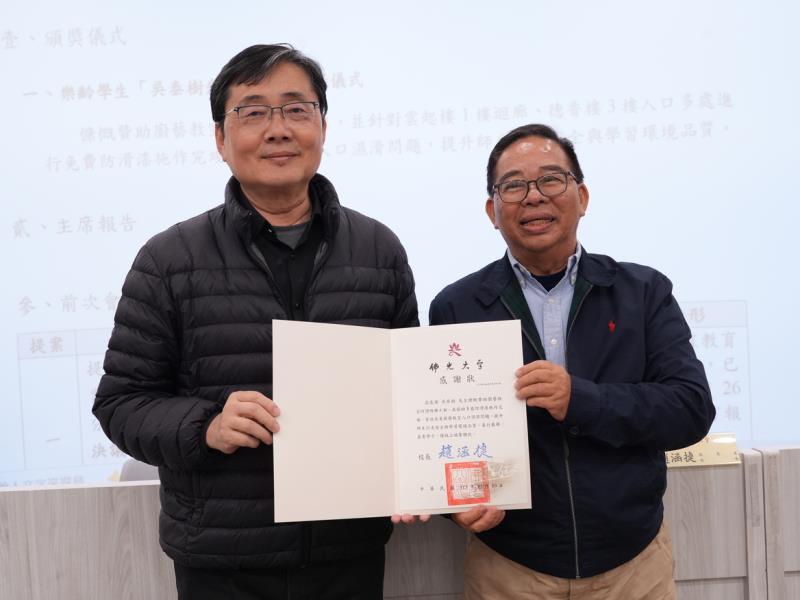 為提升校園行走安全與學習環境品質,佛光大學樂齡學生吳泰樹主動慷慨贊助校園防滑工程,協助完成廚藝教室防滑階梯施工,並於雲起樓一樓迴廊及德香樓三樓入口等多處進行免費防滑漆施作,工程日前順利完工,有效改善雨天濕滑問題,讓師生通行更加安全便利。佛光大學校長趙涵㨗特別於3月10日行政會議中公開表揚吳泰樹同學,感謝他對校園環境與師生安全的用心付出。