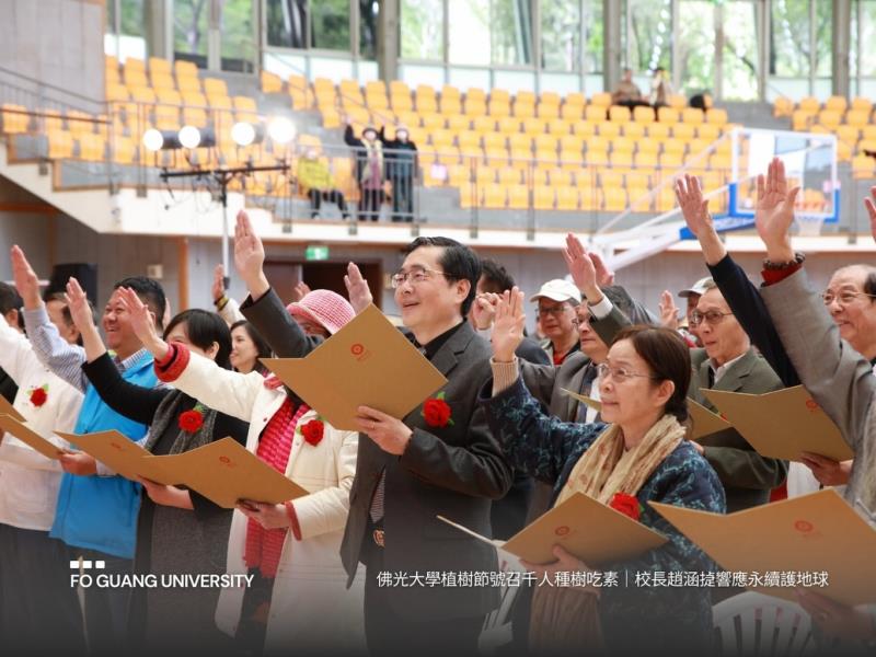 活動中並由佛光山系統大學總校長林聰明帶領與會大眾宣讀終生吃素誓詞,為守護地球立下承諾,推動公益植樹與蔬食生活理念,共同實踐永續發展目標。透過植樹與推廣蔬食生活,倡導「種樹護生、低碳飲食」的環保理念,並結合教育與公益力量,讓永續行動從校園出發,向社會持續擴散。