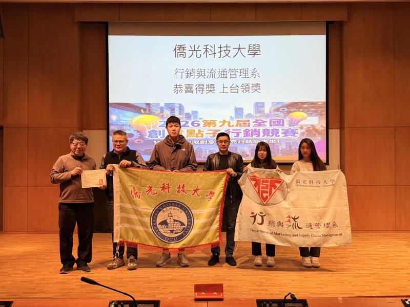 僑光科技大學行銷與流通管理系學生於「2026年第九屆全國創意點子行銷競賽」中表現亮眼,以臺中外埔水流東休閒農業區為主題發想創意行銷方案,一舉奪得多媒體創作類金牌、行銷企劃案組銀牌及科技應用組銅牌三項獎項,在全國267支參賽隊伍中脫穎而出,展現學生在創意發想、行銷策略與科技應用整合上的優異表現。