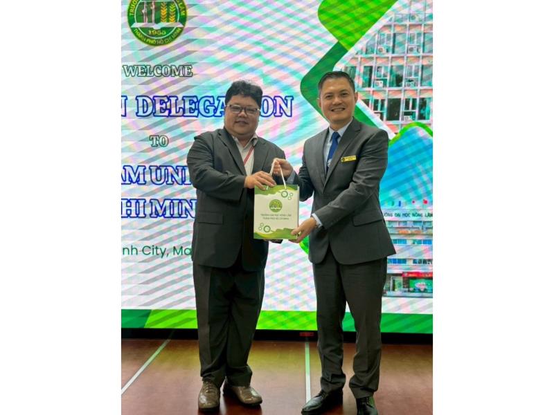 圖5:嘉大國際處國際交流組陳宣汶組長參加越南招生參訪交流團,並與越南胡志明市農林大學Dr. Nguyen Tat Toan校長互贈禮物。