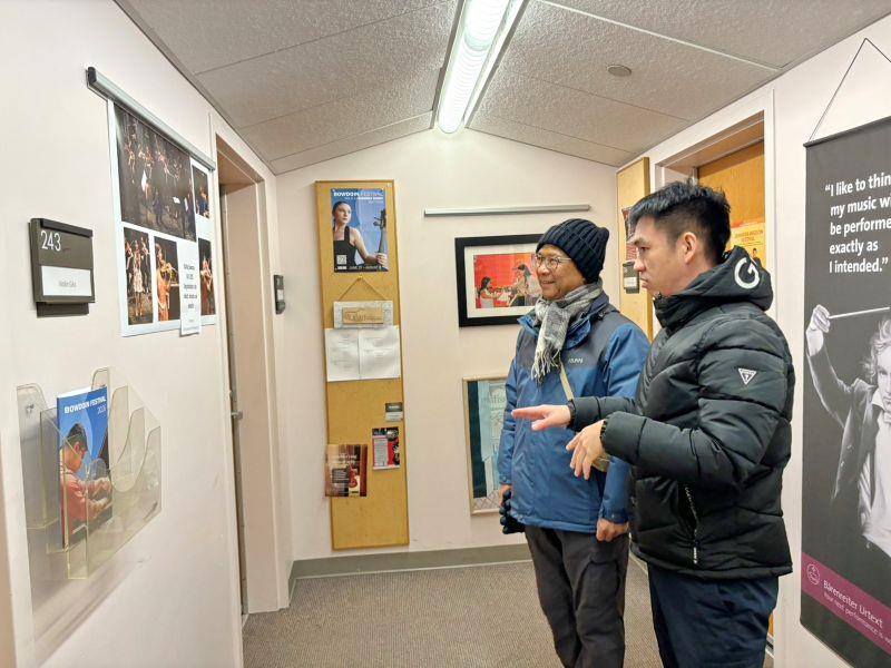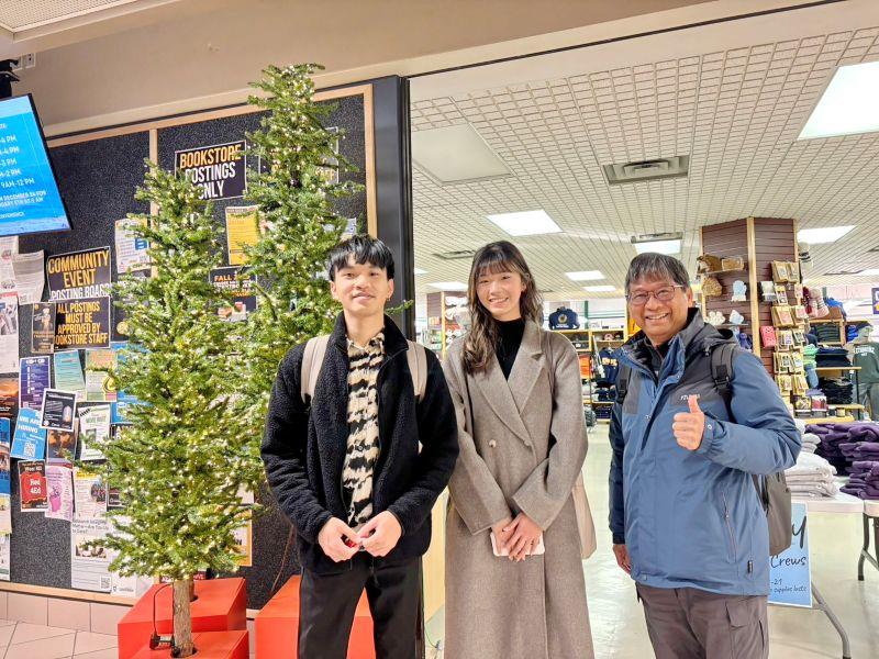 訪問萊斯布里奇大學期間,適逢嘉大音樂學系林呈衛同學及行銷與觀光管理學系藍云希同學於該校進行交換學習,張教授特別探視兩位同學,關心其課業與生活適應情況,並鼓勵積極拓展國際視野。林呈衛同學表示,在萊斯布里奇大學主修打擊樂,拓展了演奏技術層次,也累積更深厚的基礎,在樂團排練演出中更感受到跳脫框架的創造力。萊斯布里奇大學外籍生以歐裔與非裔為主,校園內幾乎看不到華人,他的室友是一位在加拿大生活了九年的奈及利亞人,透過參與足球、桌球、西洋棋等課外活動,讓他有機會接觸多元文化,異國生活充滿溫度與樂趣。張教授特別交代林呈衛同學要努力做好外交角色,讓萊斯布里奇大學學生對臺灣感興趣,並能到臺灣及嘉大進行參訪交流。