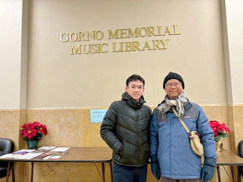 圖5:張俊賢教授在嘉大音樂系傑出校友、美國辛辛那提大學音樂學院小提琴演奏博士候選人陳上義陪同下參訪辛辛那提大學音樂學院。