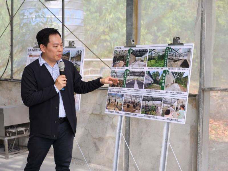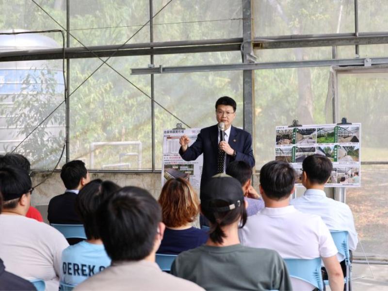圖2:農學院江彥政副院長於現場說明造園景觀實作場配置與功能,強調透過分區規劃強化學生施工實作與植物應用能力。