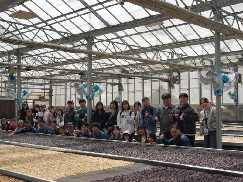 圖3:在農藝系黃文理教授的帶領下參觀咖啡溫室,並透過咖啡農場主人方政倫先生的引導,認識咖啡豆處理流程及各階段狀況。