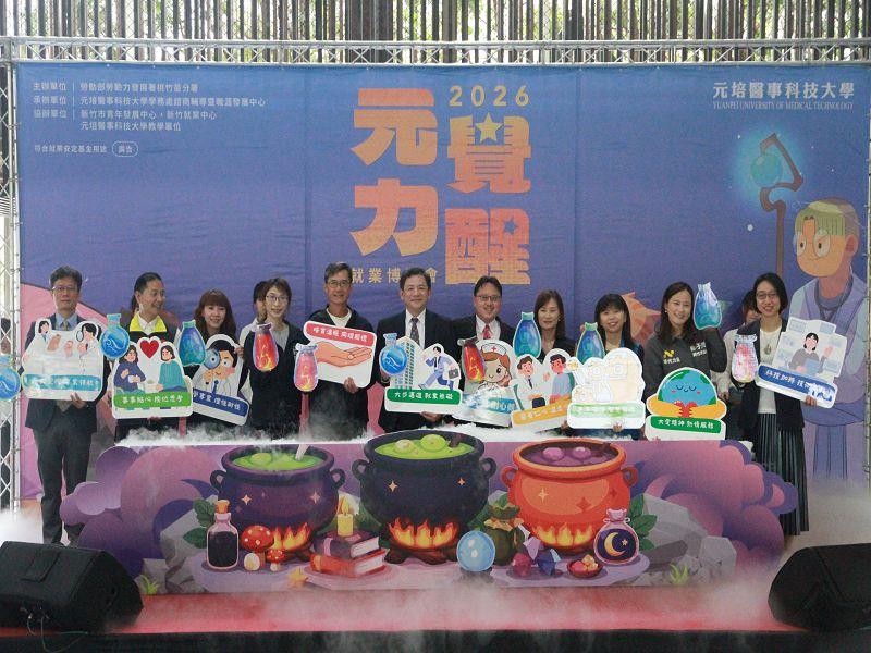 元培就博會以「元力覺醒」為主題,由王綮慷校長與新竹市副市長林琨瀚,以及勞動部勞動力發展署桃竹苗分署秘書胡伯堯、市議員陳啟源、廖子齊等多位貴賓共同啟動「施展魔藥湯鍋」的儀式開幕,象徵元培正不斷淬鍊著醫事人才,在職場展現多元專業能力。