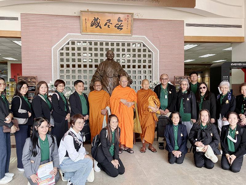 圖02.南華大學國際長林純純(前排左2)安排泰國摩訶朱拉隆功大學參訪團參觀無盡藏圖書館,並與創辦人星雲大師銅像合影。
