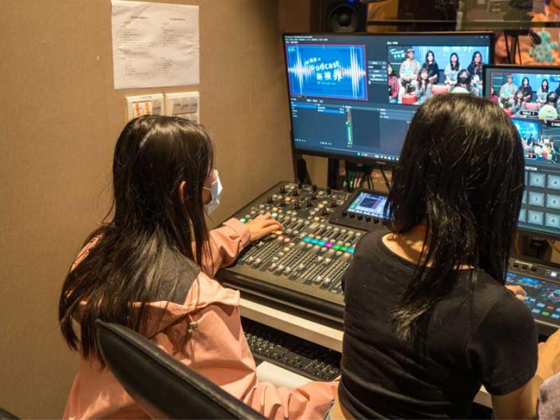 在Podcast錄音實作中,學生走進校內錄音室,實際面對業界等級的收音設備與控台介面,將課堂上完成的企劃稿轉化為節目內容。有組別在錄製時,索性把參與活動的觀察、緊張與興奮直接說進節目裡,讓錄音過程變成一場真實對話,也為作品留下當下心情的紀錄。接續安排的影音播客直播體驗,則讓學員輪流嘗試主持、導播、成音與直播製作,透過鏡頭切換與現場節奏協調,感受聲音與影像結合後,節目呈現層次如何被拉開。