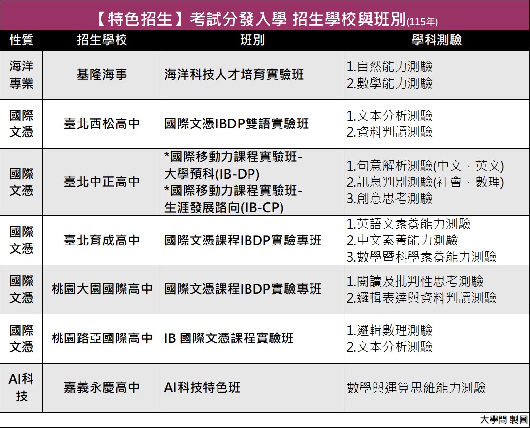 普通型高中依照學校發展優勢及社會需求規劃的特色班級,通常會以「特色招生考試分發」這個入學管道來招收志向興趣與能力符合的同學。115學年度共有7所公立高中開設此類特色班,類型有國際文憑實驗班、海洋科技實驗班、AI科技特色班等,提供學術傾向或對特色課程有興趣的同學報考。