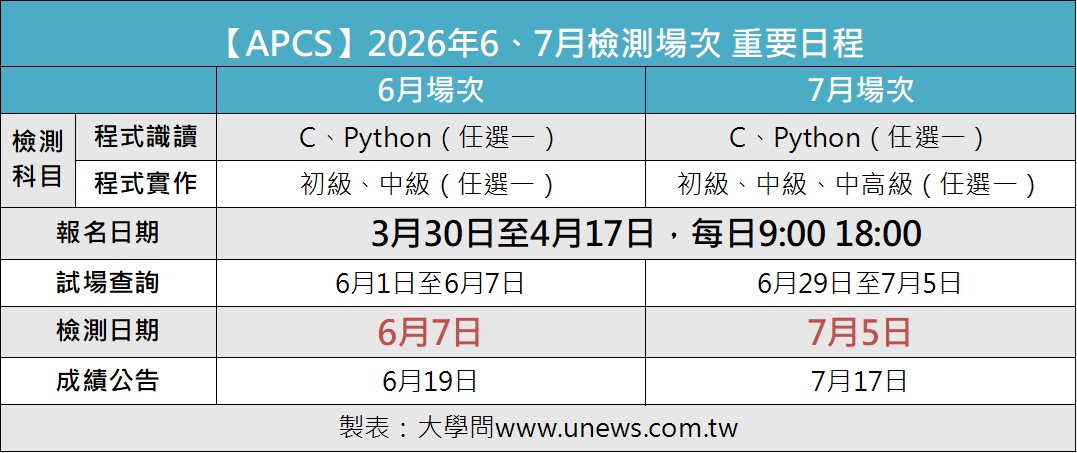 想就讀資訊相關學系的同學請留意,「大學程式設計先修檢測」(APCS)在2026年6、7月各有一場檢測,預計於6月7日及7月5日舉行,報名時間自2026年3月30日至4月17日截止。檢測科目包括「程式識讀」和「程式實作」,考生可依需求,任選程式語言和實作等級,直接線上報名。