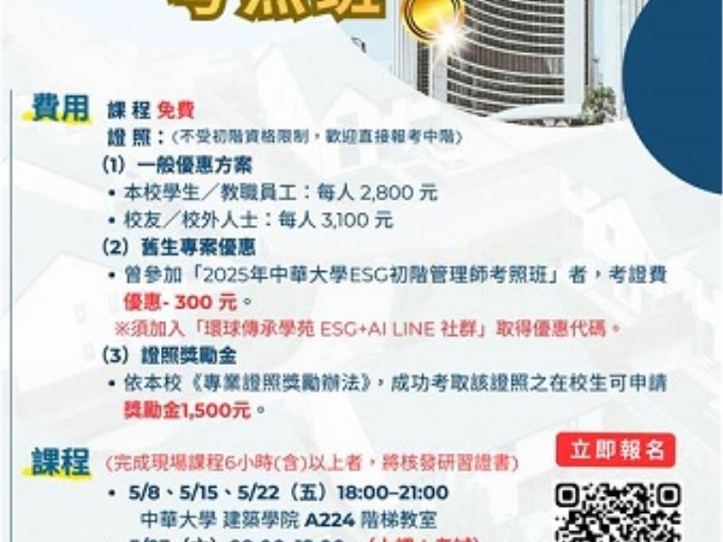 課程預計於5月8日、15日、22日晚間於中華大學建築學院A224階梯教室授課,5月23日於校內進行測驗。通過者可取得「ESG中階管理師證照」及「中華大學 × TISDA」聯名研習證書。中華大學學生考取證照後,更可申請1,500元專業證照獎勵金,曾參加2025初階班者另享300元折扣優惠。