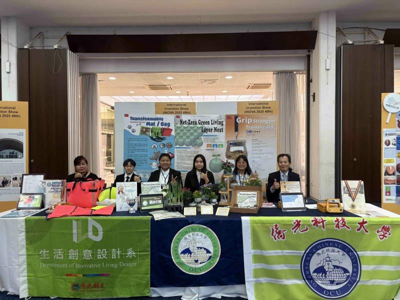 「Net Zero Green Living Layer Nest」勇奪金牌、大會特別獎、羅馬尼亞特別獎,由李世珍副教授與廖慧美老師共同指導,學生蔡書瑜、張莉雅、鍾慧琳等人研發完成。該作品以淨零碳排為核心,以回收紙、農漁業廢棄物為材料,研發無土育苗體,為環境永續提出解決方案。憑藉創新的材料與友善環境的設計思維,榮獲金牌,同時奪下大會特別獎與羅馬尼亞特別獎,成為全場焦點;「Grip Strength Training Aid」勇奪金牌、羅馬尼亞特別獎,由趙子芳教授指導下,學生陳姵心、黃恩庭研發的創新輔助裝置,專為長者及需要手部復健的族群設計。作品結合人體工學與可調式訓練機制,不僅能協助使用者進行手部肌力訓練,更兼具居家使用的便利性。該作品兼具設計巧思與實用價值,勇奪金牌並再度摘下羅馬尼亞特別獎;「Transformable Mat/Bag」勇奪金牌、羅馬尼亞特別獎,由楊雅淳教授指導,學生鄭以欣、柯明律、陳漢忠、許文萓共同參與。作品除將日常收納與行動便利結合,收納袋能展開為可供休憩使用的墊子,更兼具寵物外出攜帶性與多功能特質。此創新設計回應戶外活動與日常生活的需求,榮獲金牌並獲羅馬尼亞特別獎肯定。