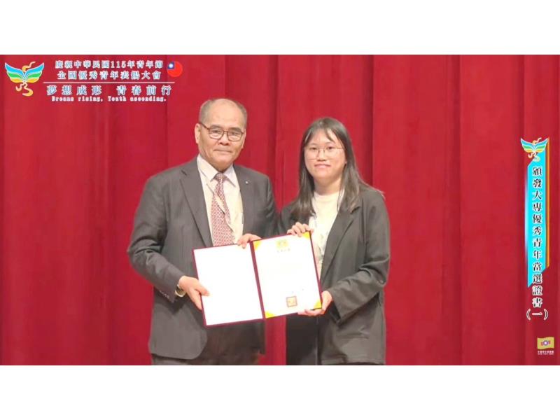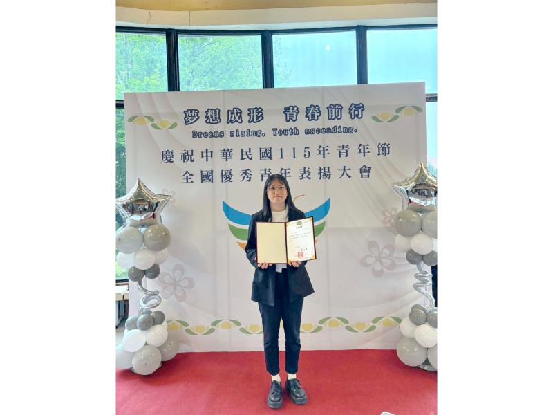 嘉義大學農藝學系四年級許云?同學,憑藉優異的學業表現與長期投入校內外服務的傑出事蹟,榮獲中國青年救國團「115年大專優秀青年」全國代表殊榮,於3月29日受邀到臺北參加「全國優秀青年表揚大會」,展現嘉大學子允文允武、關懷社會的卓越風範。