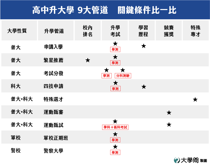以大學四年制日間部來說,高中生的升學管道基本上有5種為人所熟知,包括:「個人申請」、「考試分發」、「繁星推薦」、「四技申請」、「特殊選才」,其他還有「運動甄審」、「運動甄試」、「軍校正期班」、「警察大學」。除了「特殊選才」、「運動甄審」、「運動甄試」外,所有管道都需要學測成績。該如何選擇適合自己的升學管道呢?「大學問」(www.unews.com.tw)將高中升大學各管道所需的基本關鍵條件歸納為「校內排名」、「升學考試(學測、分科等)」、「學習歷程」、「競賽獲獎」、「特殊專才」等項目,同學可以利用這些項目快速盤點自己適合選擇哪種升學管道。