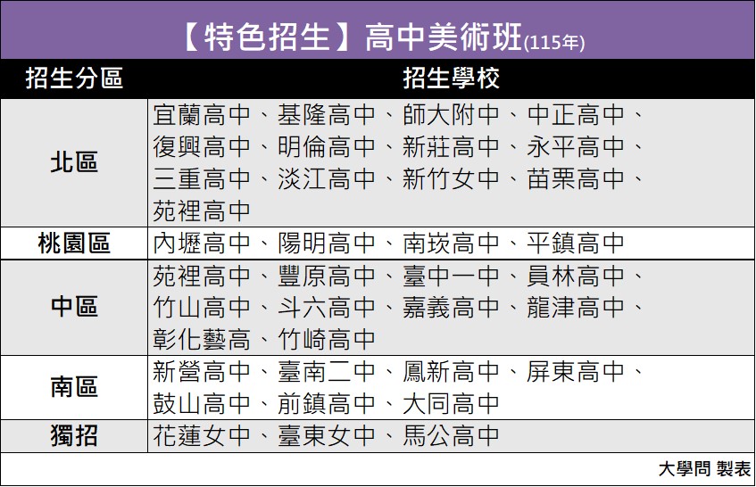「美術班」的招生學校分為北區、桃園區、中區、南區、獨招等五類,考生只可選擇一區報名。甄選入學方式包括「聯合分發」或「競賽表現」兩種。其中「聯合分發」需要先報考美術術科測驗(素描、書法、彩繪創作與延伸A:現場實作、彩繪創作與延伸B:紙筆測驗、水墨),之後再報名該區的「聯合分發」,選填志願後,依術科加權後的甄選總成績,擇優分發錄取。