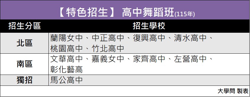 「舞蹈班」的招生學校分為北區、南區、獨招等三類,考生只可選擇一區報名。甄選入學方式包括「聯合分發」或「競賽表現」兩種。其中「聯合分發」需要先報考舞蹈術科測驗(芭蕾、現代舞、中華民族舞、舞蹈即興),之後再報名該區的「聯合分發」,選填志願後,依術科加權後的甄選總成績,擇優分發錄取。