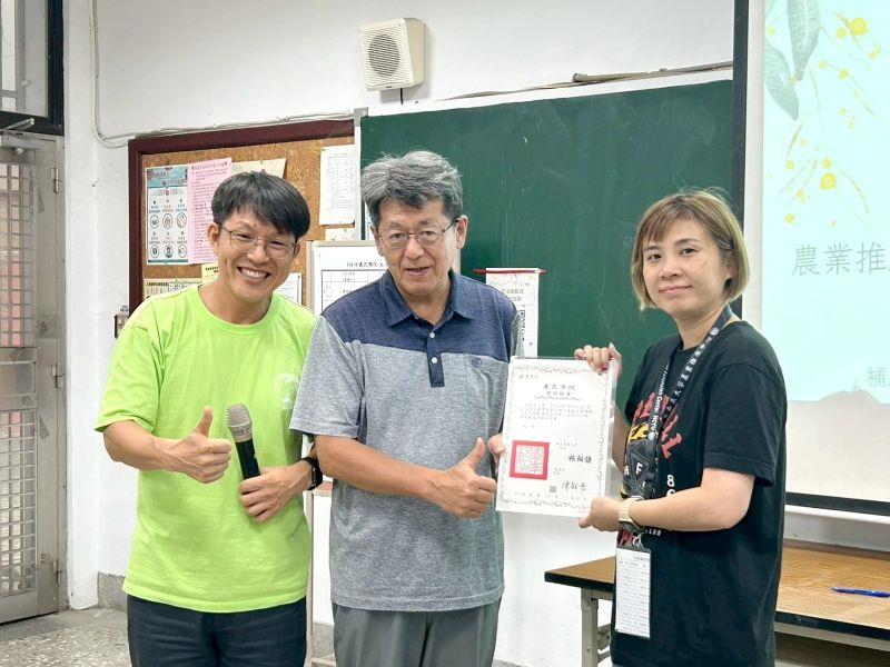 圖4.園藝系羅靜琪助理教授(右)與林明瑩主任頒發結訓證書予白安生學員(中)。