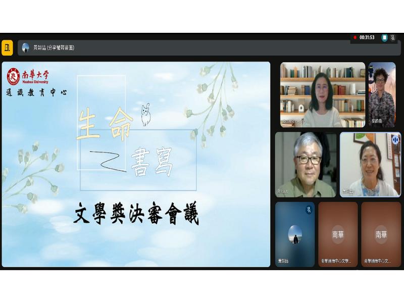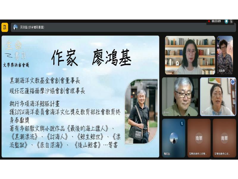 南華大學通識教育中心日前舉辦「生命書寫文學獎」活動廣受學生熱烈迴響,展現校園豐沛的人文創作能量。本屆文學獎共徵得來自不同年級與系所的29份參賽作品,內容涵蓋人生經驗、情感轉折與生命省思。經複審後,計有23篇優秀作品脫穎而出,進入決審階段。決審會議於日前以Google Meet線上方式舉行,並特邀知名作家廖鴻基、吳鈞堯及彭樹君擔任評審,進行最終評選。