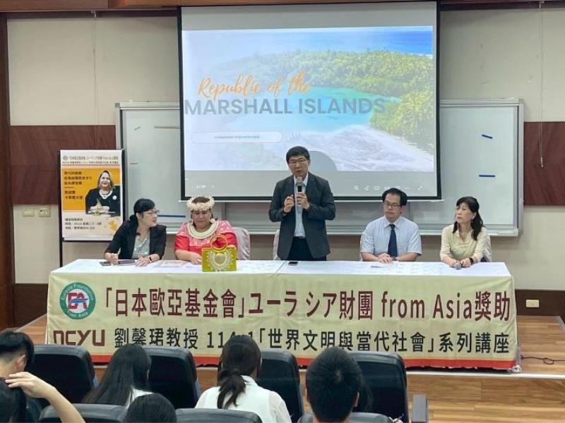 本計畫首場講座9月16日在民雄校區教育館登場,特別邀請馬紹爾群島共和國駐台大使安潔奈特.卡蒂爾(Anjanette Kattil)以「現代的挑戰:從馬紹爾歷史文化談永續發展」為題進行分享。