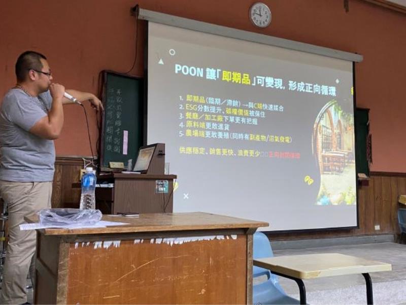 莊竣翔負責人在講座中亦介紹自家開發的「奔食POON」平台,該平台以智慧媒合系統為核心,讓「即期品」與「過剩食品」重新流通市場,透過「食物救援」模式有效連結資源與需求,實踐減少浪費、推動綠色循環經濟的理念。