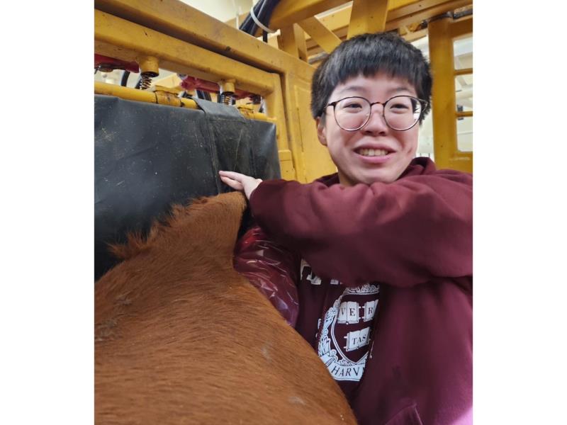 圖2:嘉大校友許珮蓁獸醫師在美國進行牛隻直腸觸診。