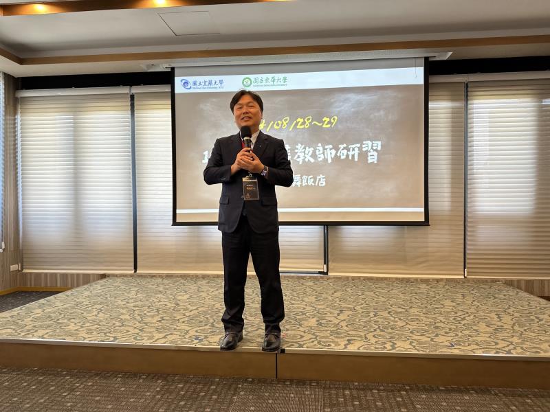 ▲國立宜蘭大學陳威戎校長於研習營開幕致詞,期盼透過跨校合作深化教師交流,攜手實踐東部高教共學願景