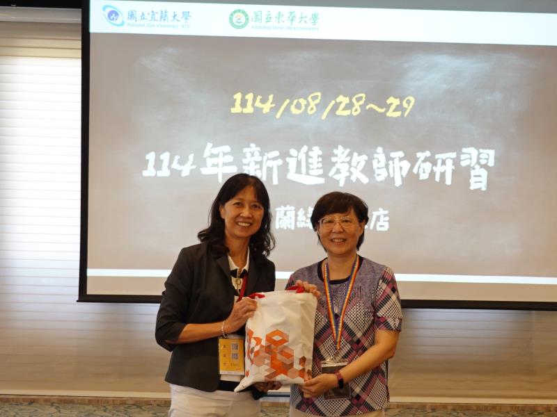▲兩校主辦單位主任(宜蘭大學許惠貞主任,左;東華大學高台茜主任,右)互贈紀念品,表達對彼此合作的感謝與期許,共同推動教師專業發展